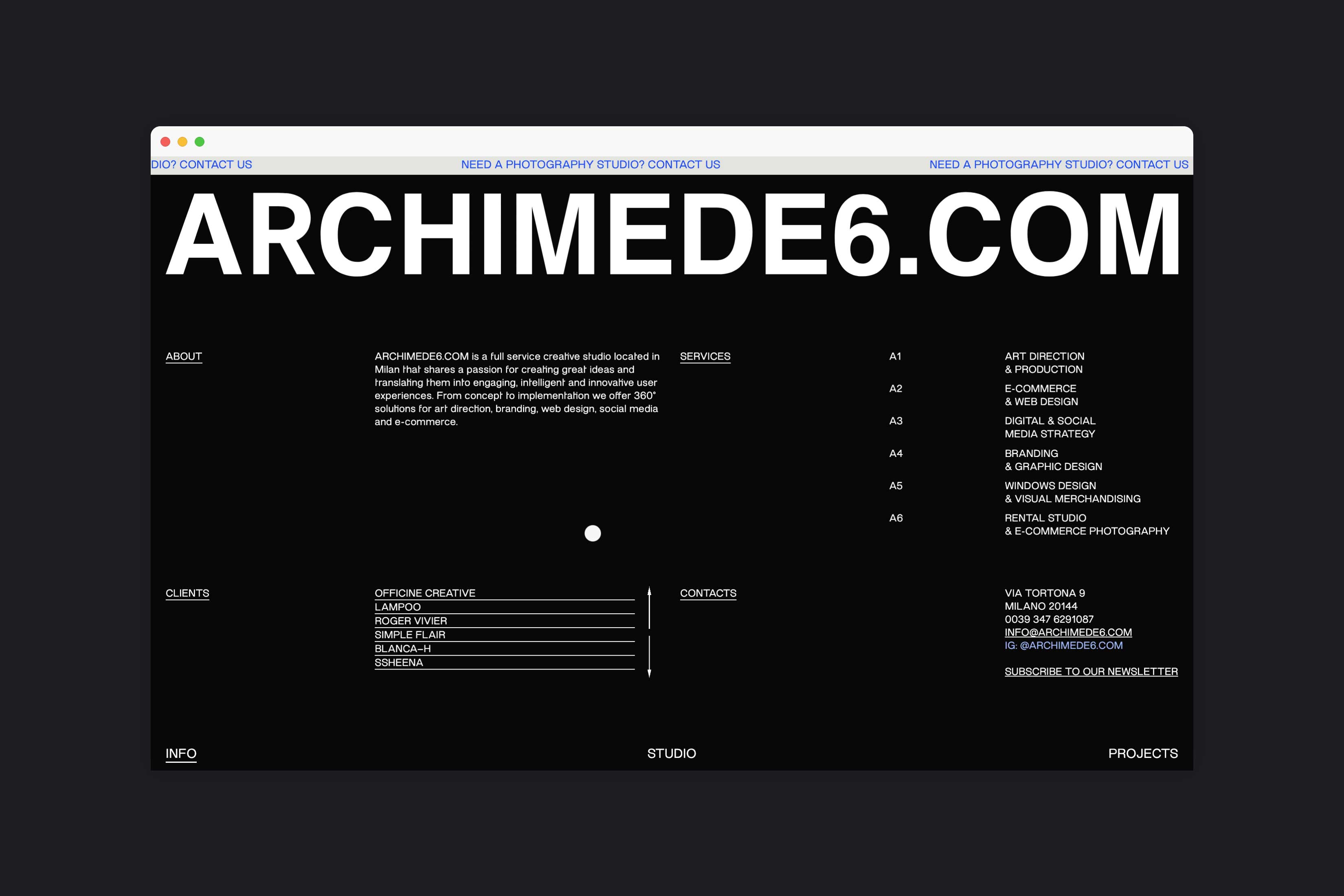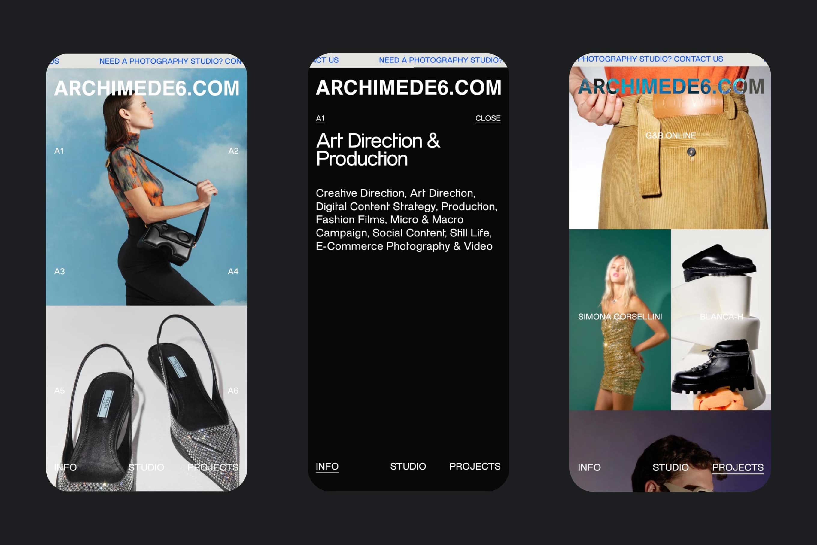 Archimede6 is a fashion communication agency based in Milan that deals with art direction, production, shooting, digital strategy, visual and web design. In 2020 they launched their new website and I took care of its web development while working closely with designers. The challenge was to present all the services that the studio offers in a clear way while communicating effectively its identity. With this in mind, the website has been developed to optimise user navigation through the use of multiple interaction effects that enhance the visitor experience.