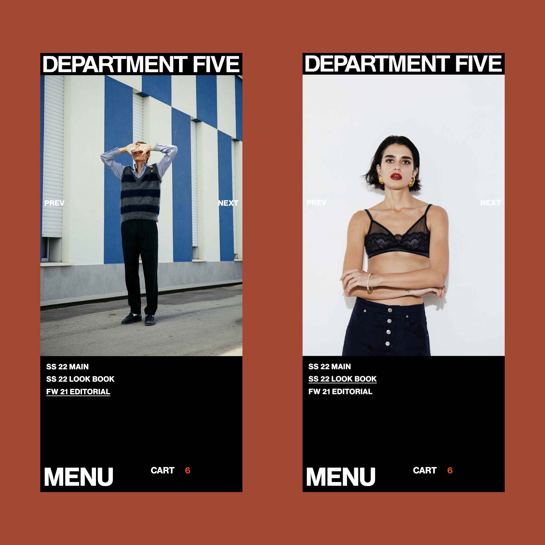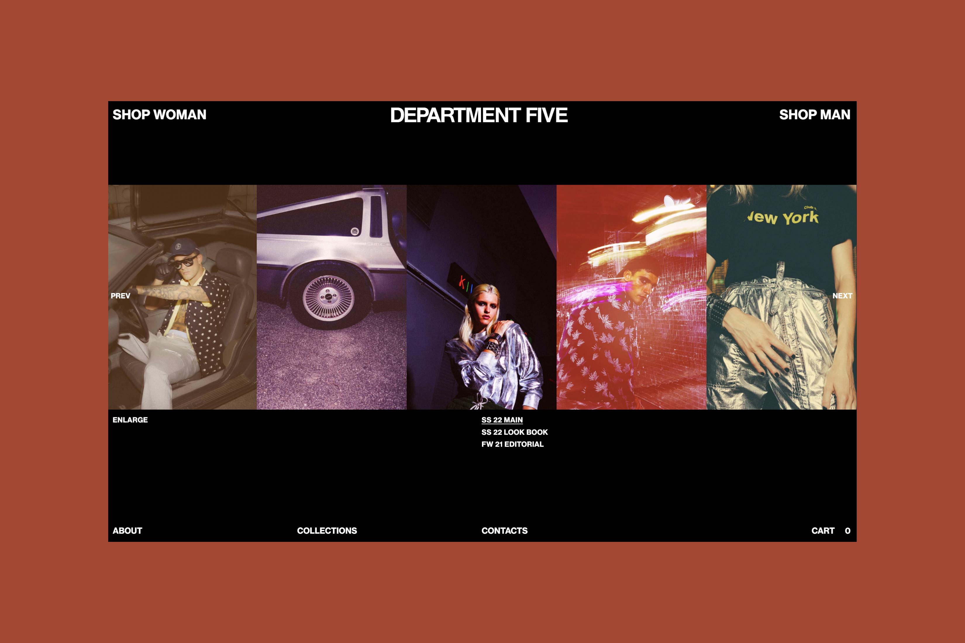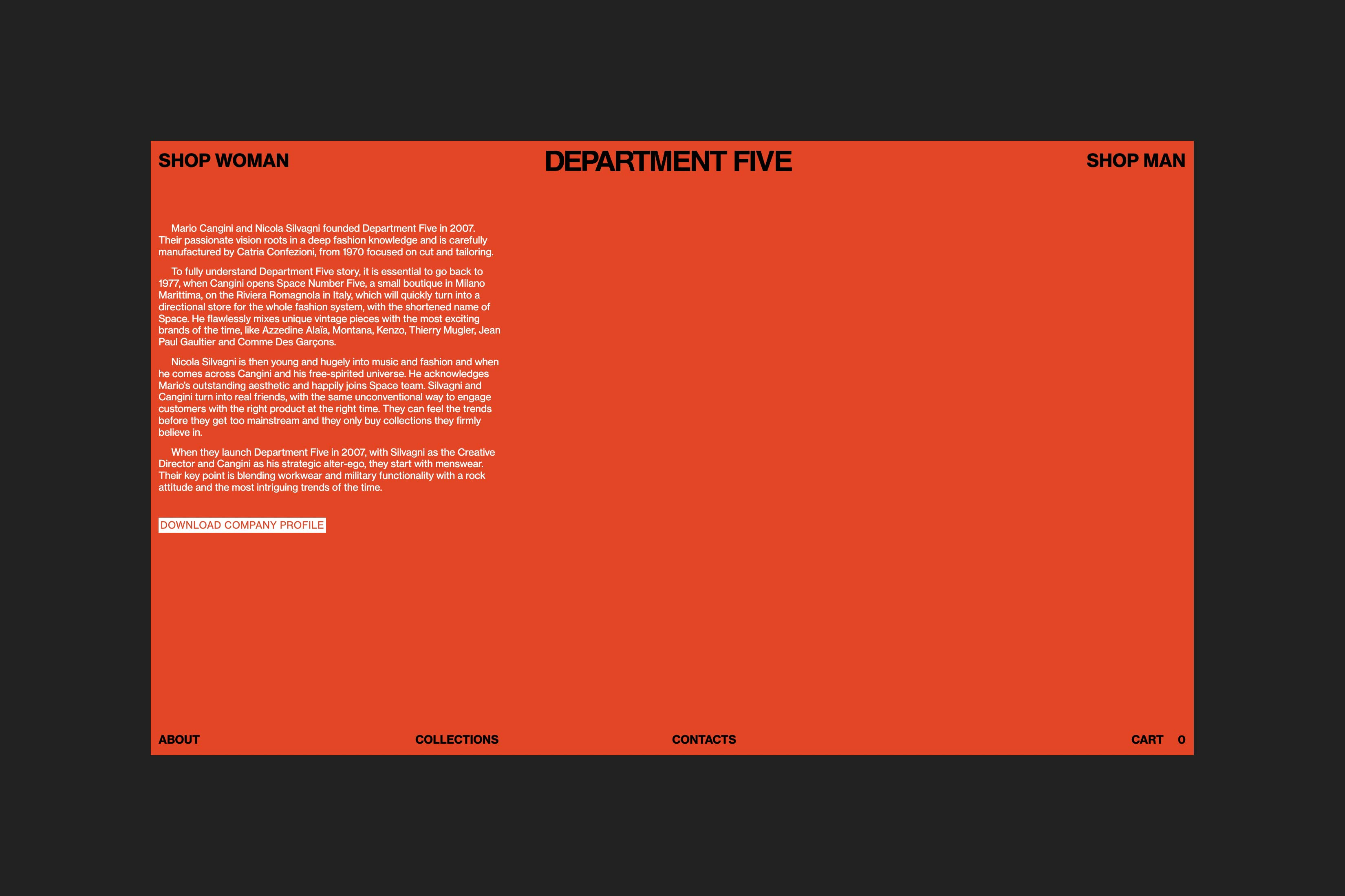 Department Five is an Italian fashion brand founded in 2007 by Mario Cangini and Nicola Silvagni that blends workwear with rational functionality while drawing inspiration from the rock music scene. In 2021 they launched their e-commerce website and I took care of its web development while working closely with designers. The challenge was to embed the brand personality into an e-commerce type website, with this in mind the website has designed been developed to be bold yet functional, with a brutalist layout that is however rationally structured into a grid and few interaction effects intentionally subtle but strong.