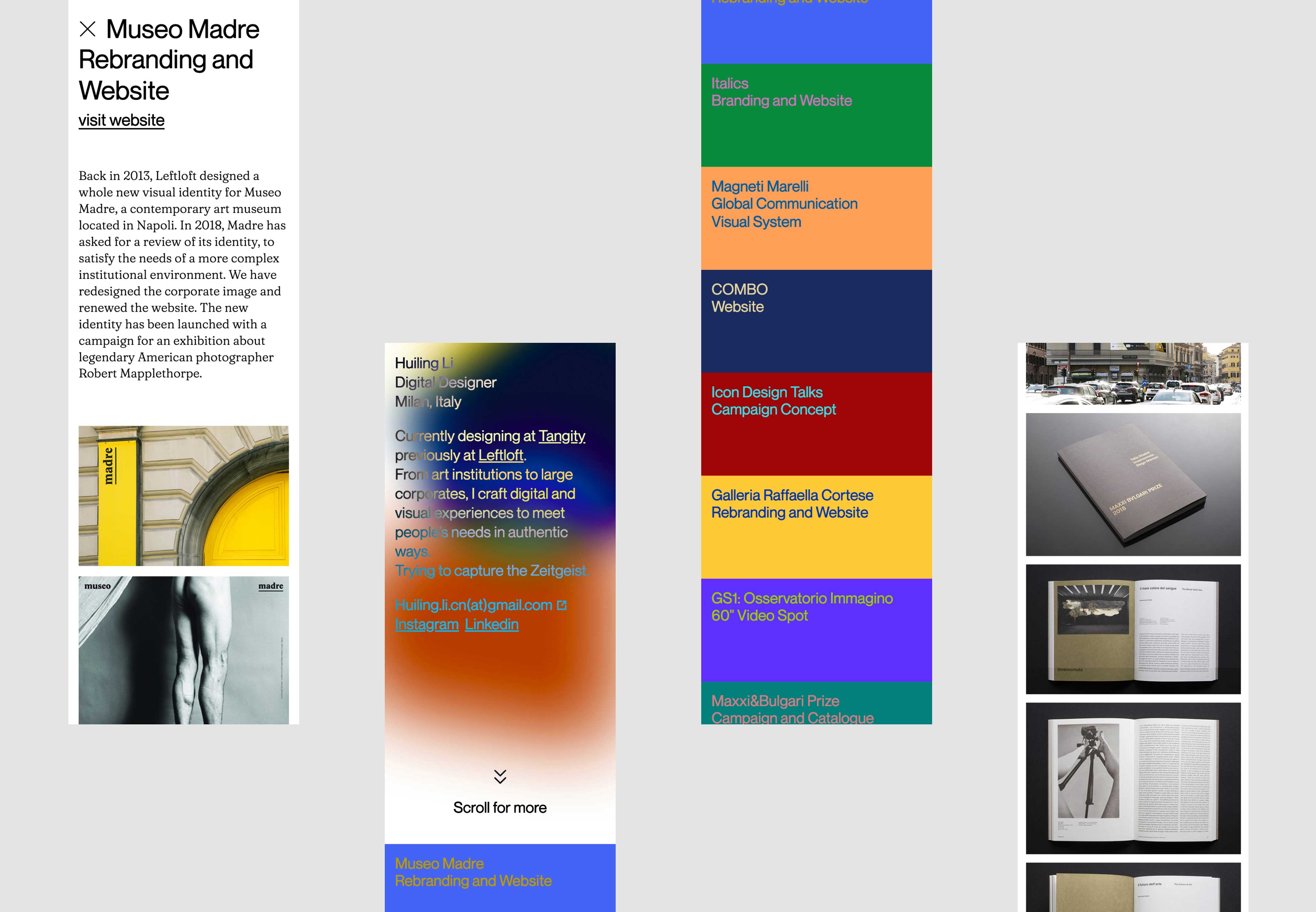 In 2020 I’ve been asked by digital designer Huiling Li to develop her new portfolio website. The challenge was to effectively gather the wide array of projects she had in her portfolio to enhance them. In the website layout, the multitude and eclectic nature of projects have been represented by the use of a rich colour palette while the website opens with generative background effects that continuously blend those colours in infinite combinations.