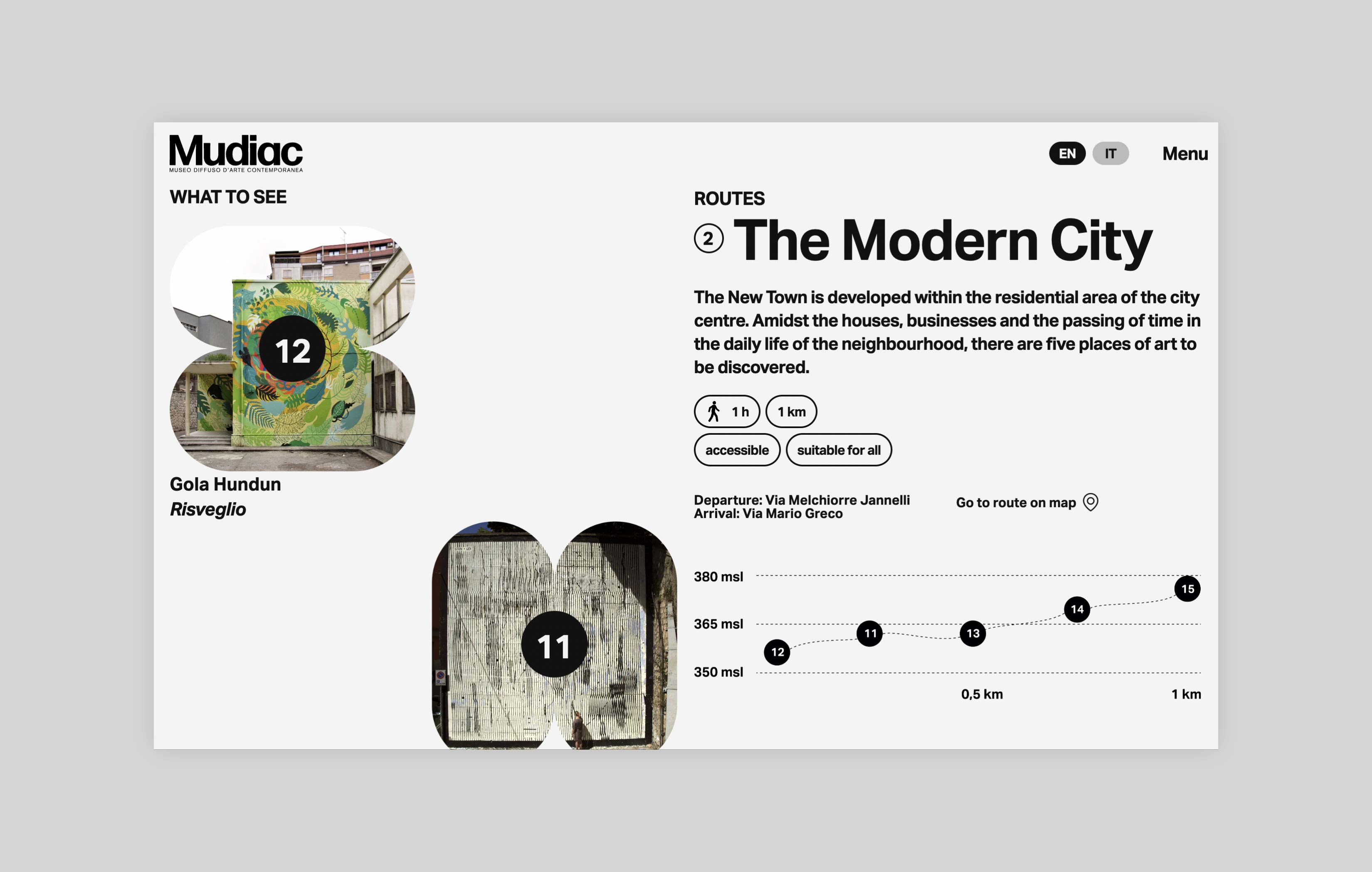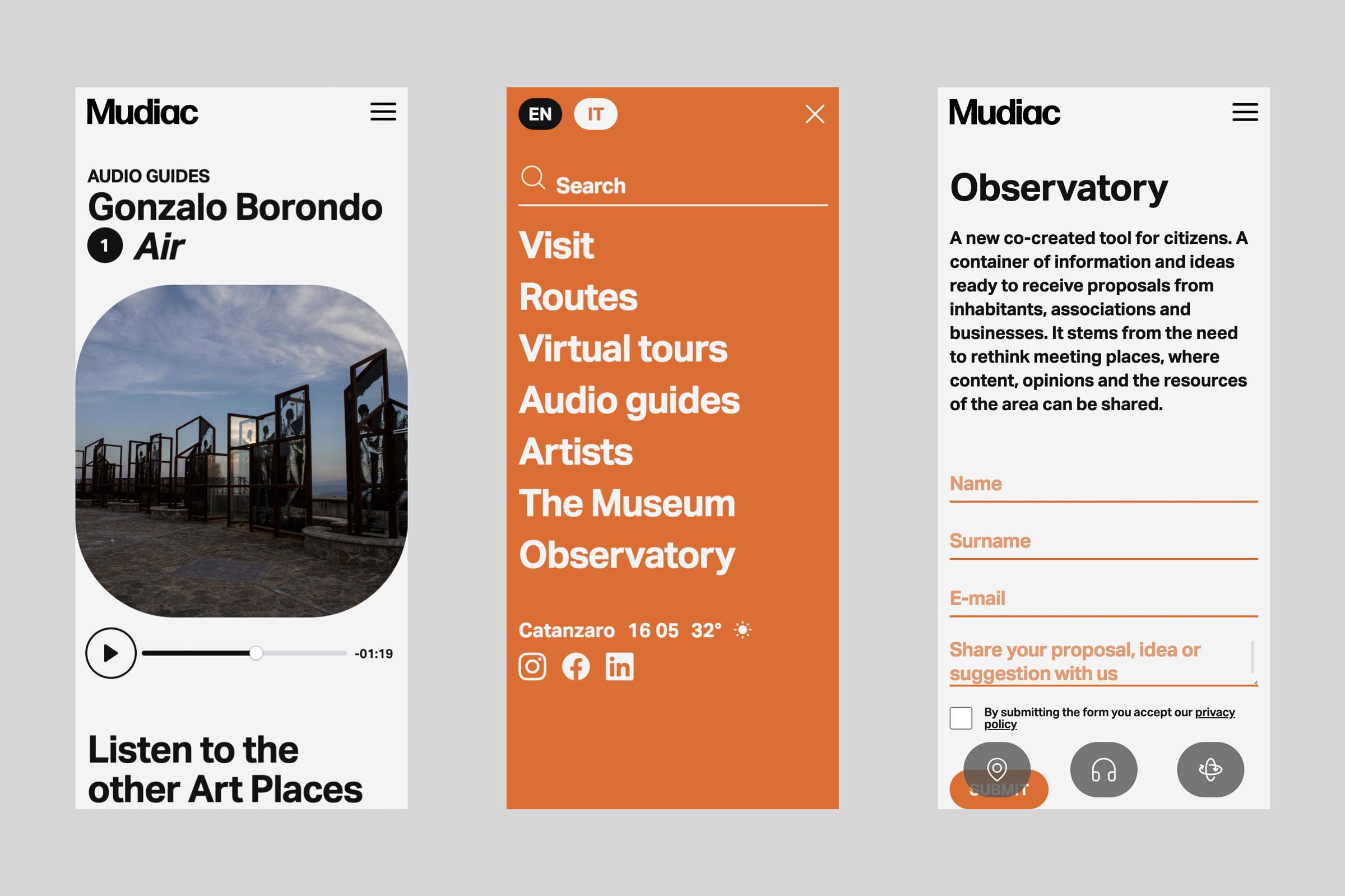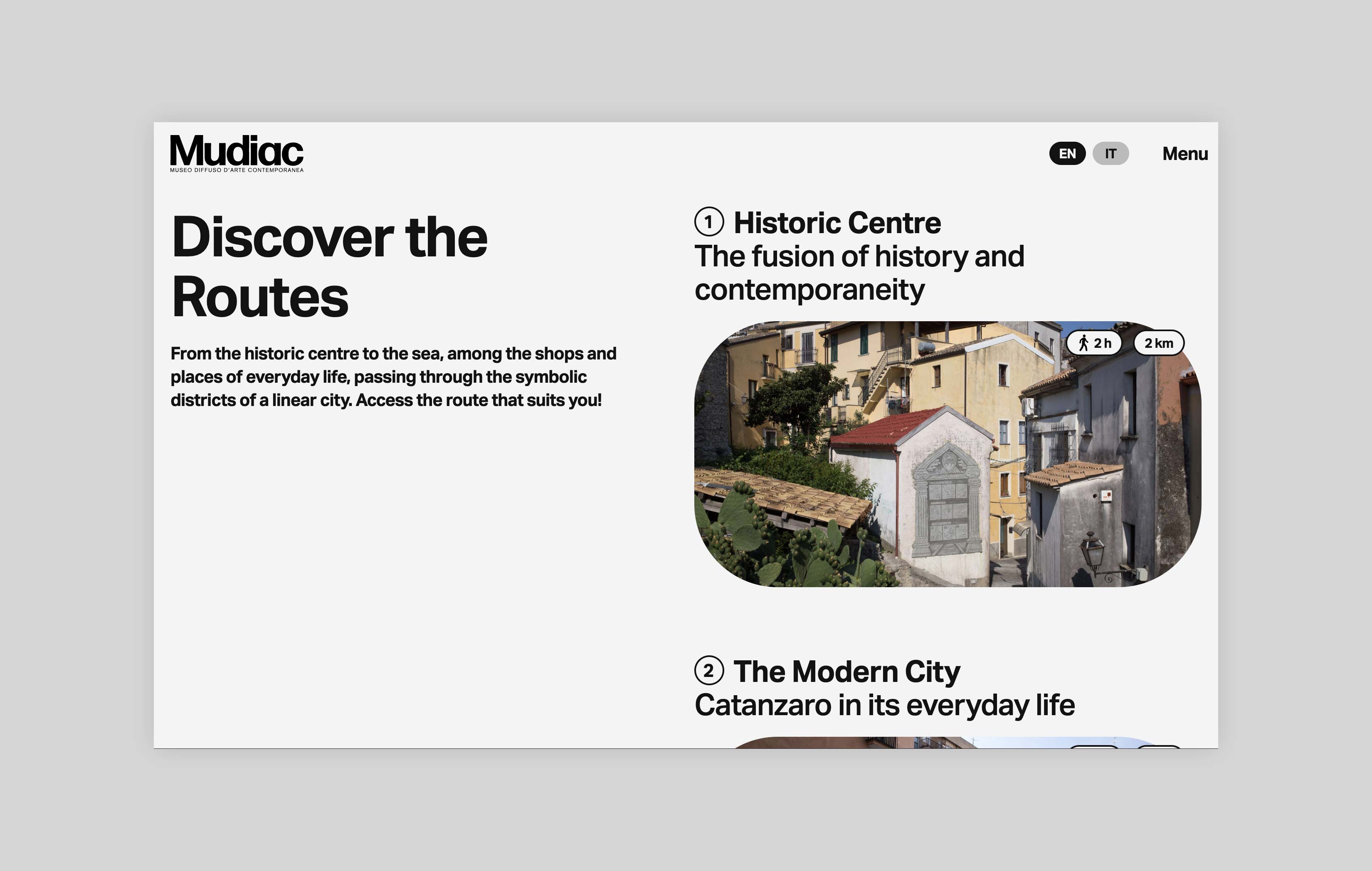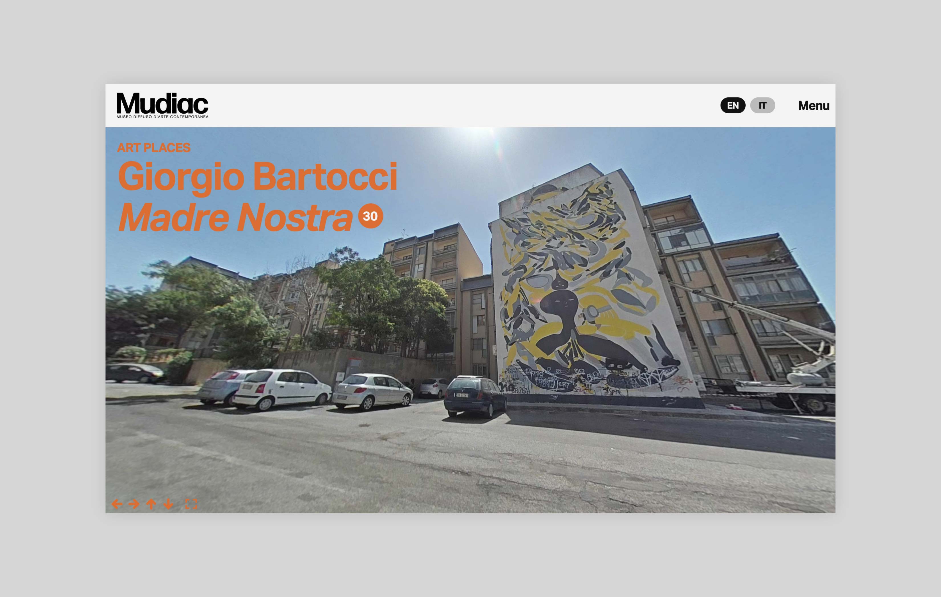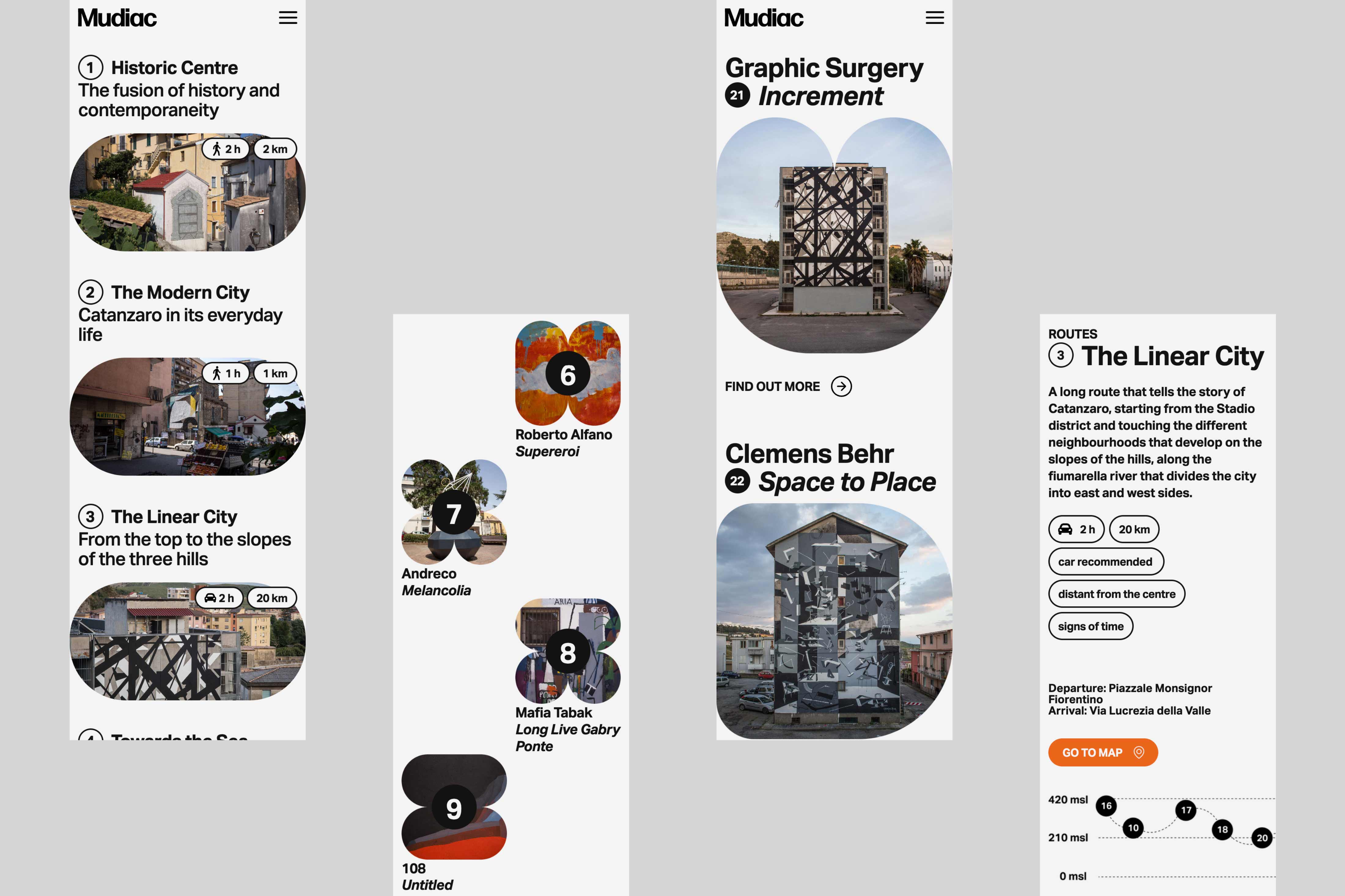 Mudiac is the Scattered Museum of Contemporary Art located in the urban space of the city of Catanzaro in the south of Italy. The Museum is the result of an urban regeneration process born with the Altrove festival, which between 2014 and 2019 led national and international artists to donate their works to the city. For its launch in 2022, Iβve been asked to design and develop a website that could function as an extension of the museum itself and expand the visitor experience.