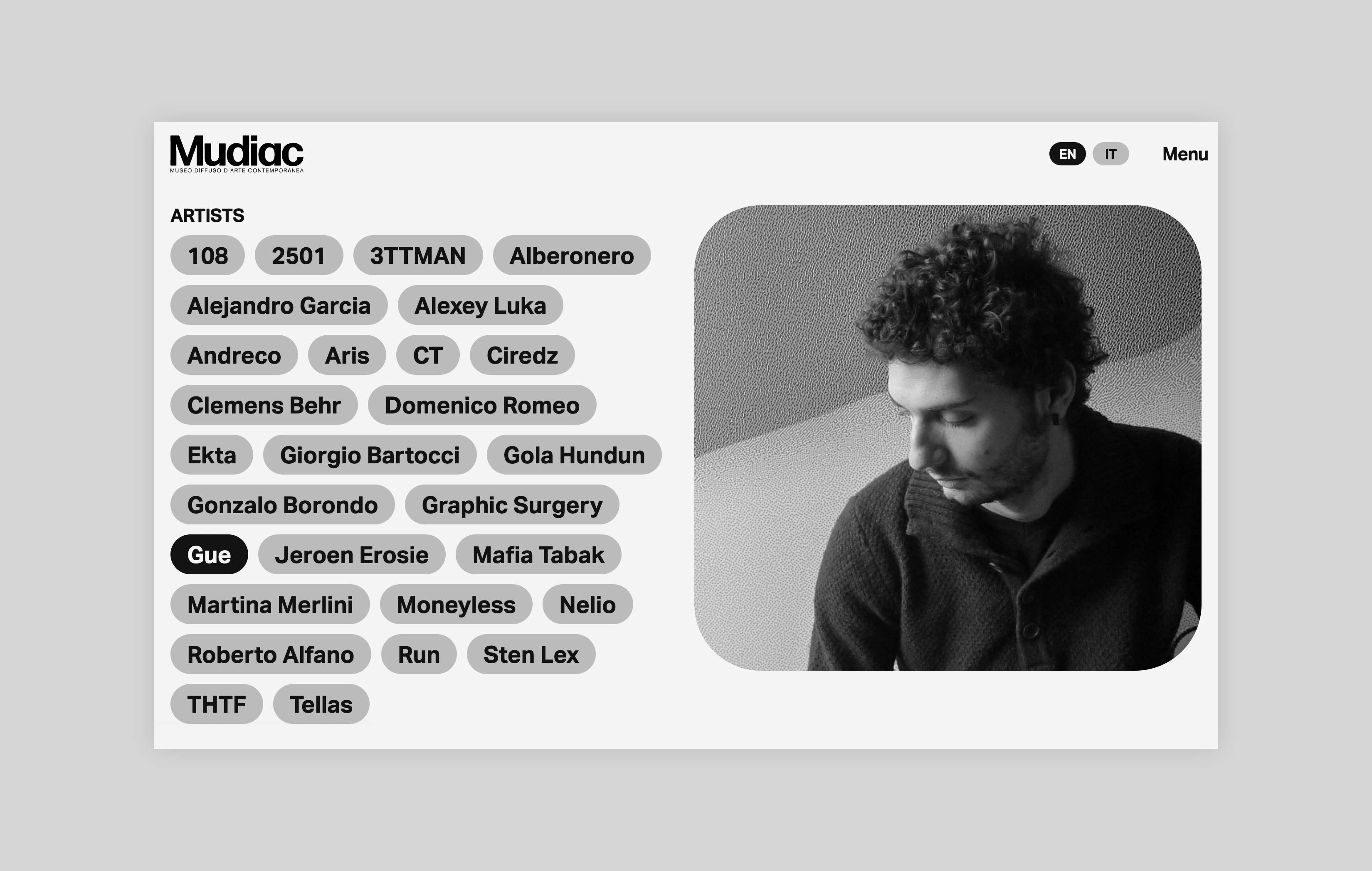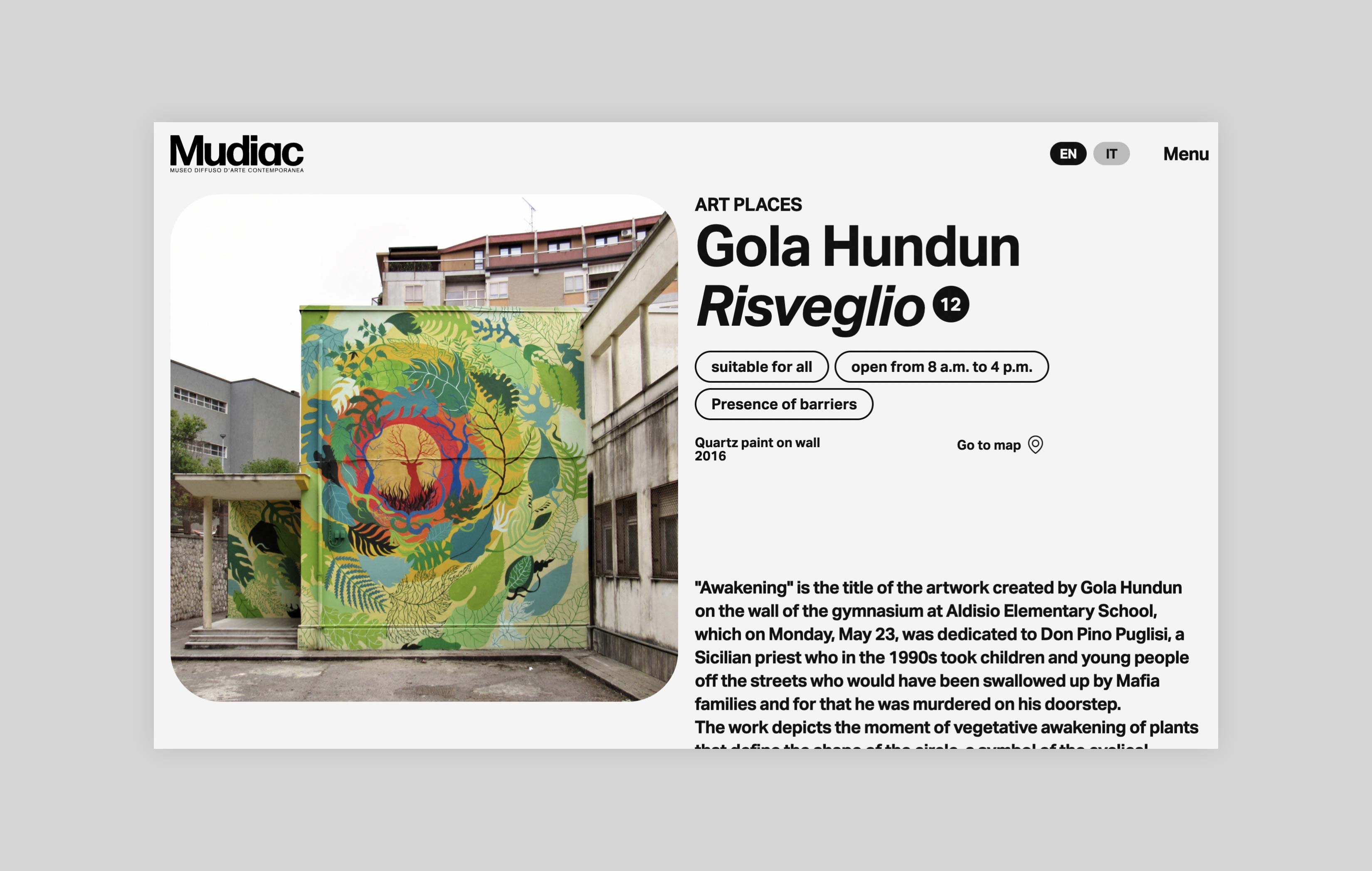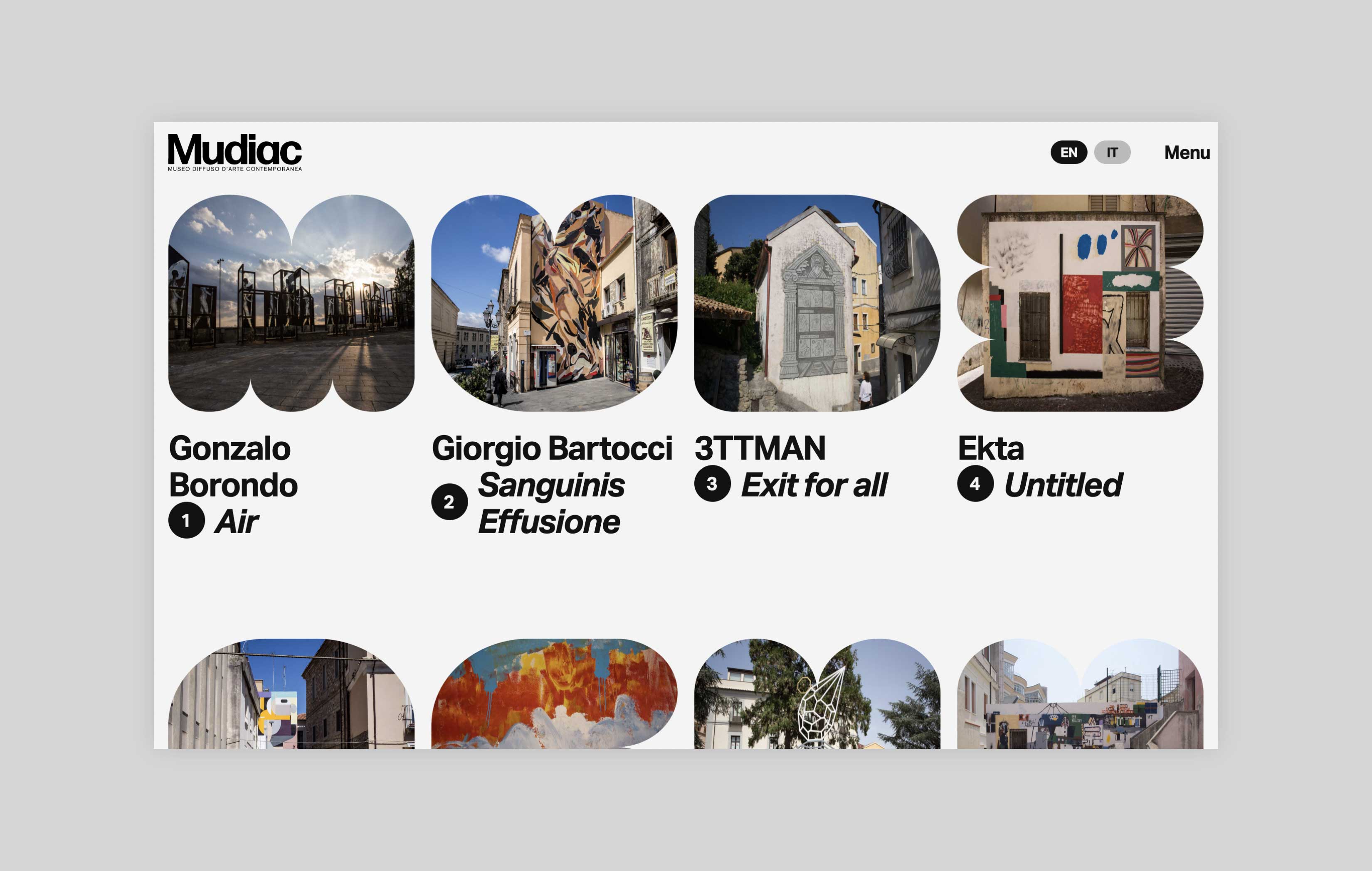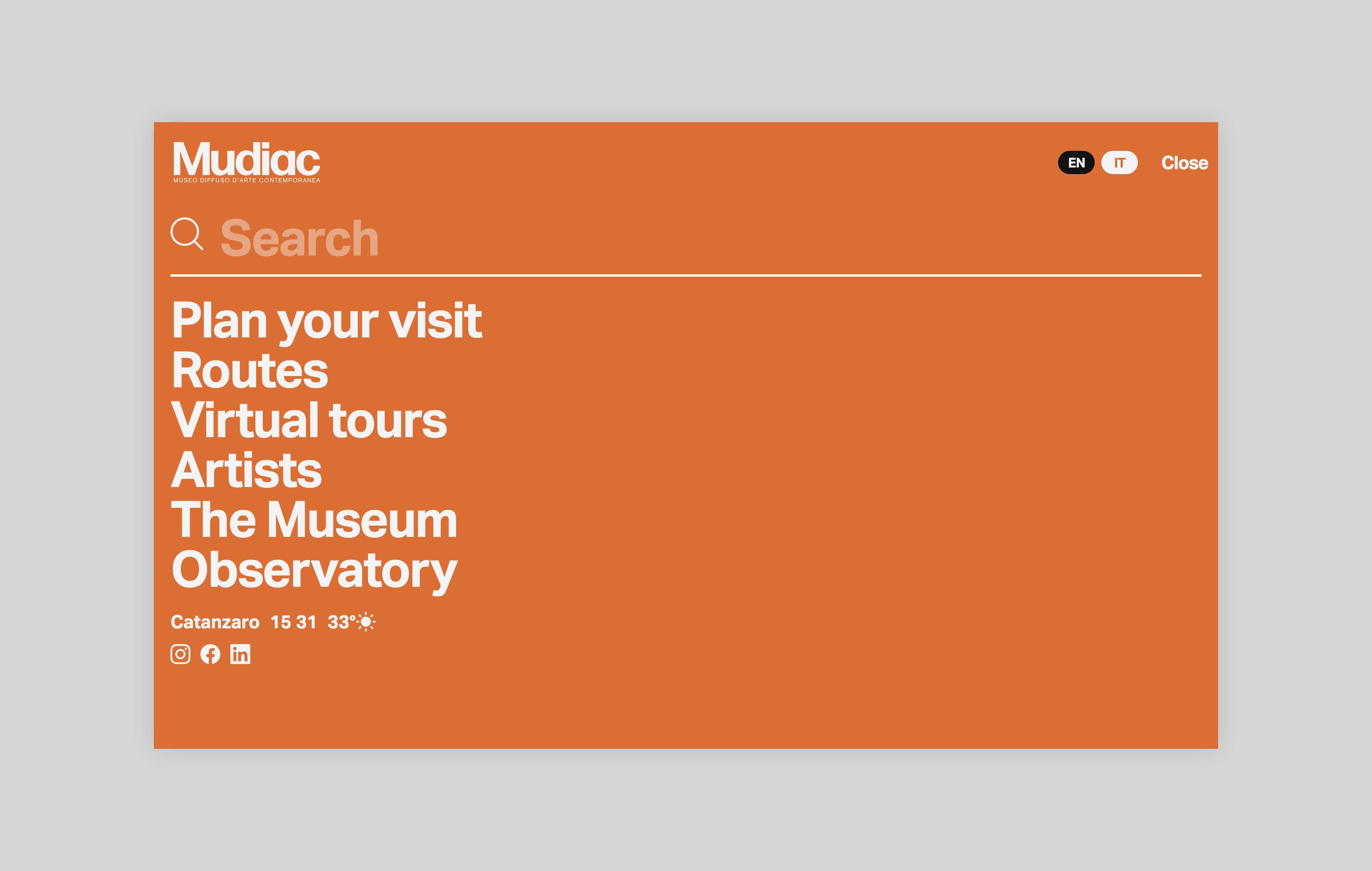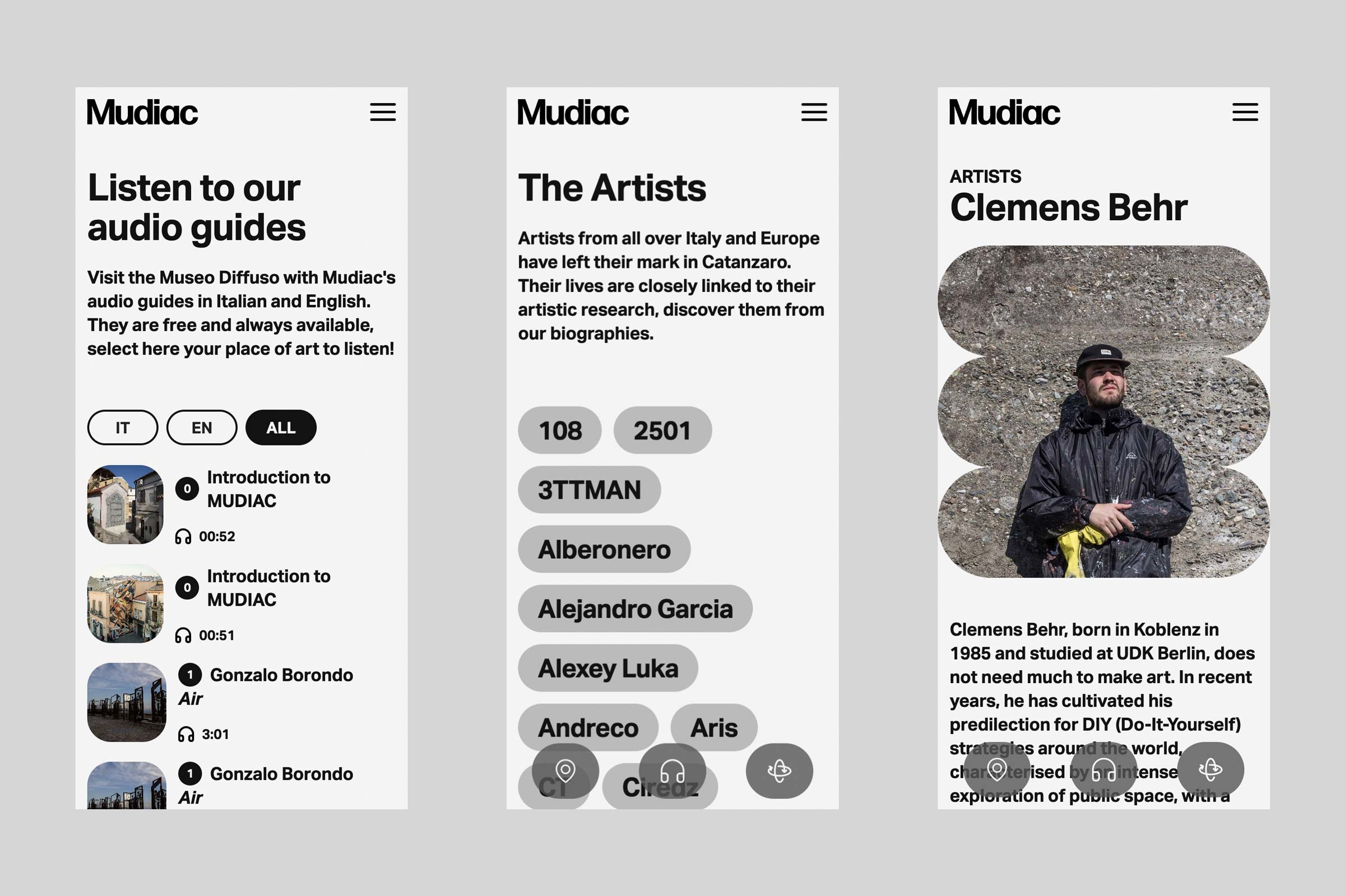 Mudiac is the Scattered Museum of Contemporary Art located in the urban space of the city of Catanzaro in the south of Italy. The Museum is the result of an urban regeneration process born with the Altrove festival, which between 2014 and 2019 led national and international artists to donate their works to the city. For its launch in 2022, Iβve been asked to design and develop a website that could function as an extension of the museum itself and expand the visitor experience.